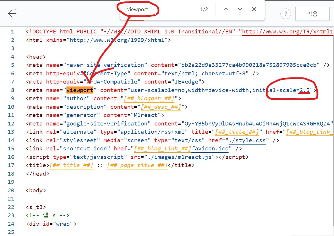 검색창에 "viewport" 를 입력 후 검색을 하면 한 개가 지정일 될 겁입니다.