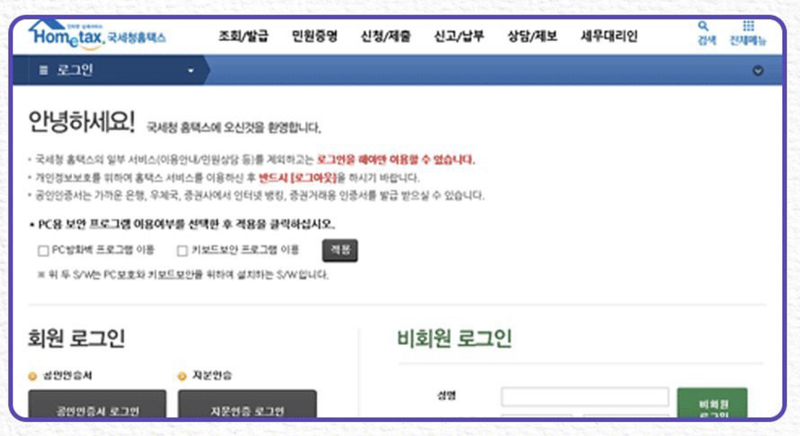-인터넷 홈택스 홈페이지 로그인 후 , 간편 신청