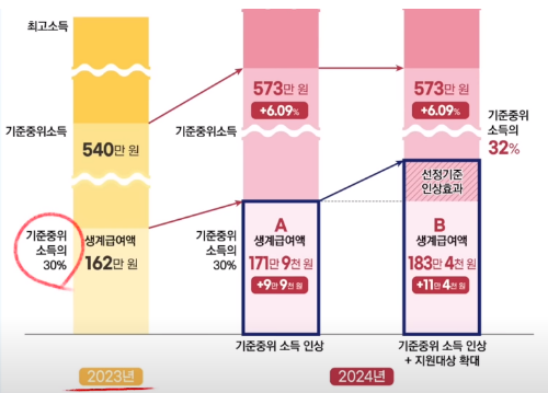 기존 중위소득이 올라서 대상자가 더확대되는 것에 더 해서 추가로 선정 기준도 32%로 상향되고