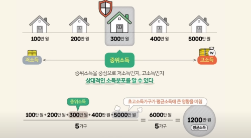 중위소득은 우리나라 전체 국민의 가구소득을 순서대로 나열했을 때 정확히 중간에 위치한 소득입니다.