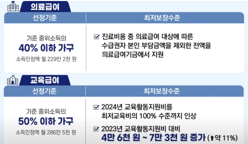 서울 기준으로 1인가구에게 월 341,000원 4인 가구는 527,000원이 지급되는 의료급여와 교육 급여는 기준중위소득만 오르고 선정기준은 기존과 동일합니다.