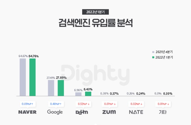 2022년 1분기 자료만 봐도 단연 네이버의 유입률은 1등입니다. 구글이 많이 따라오고 있지만 아직까지 대한민국은 네이버가 독주를 하고 있습니다.