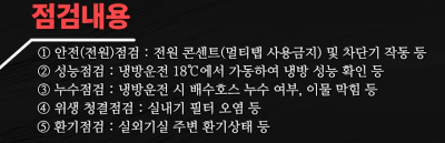 출장비용을 지불해야 하는 일이 생기지 않도록 사전 점검기간에 미리 무상으로 점검받으시고 편안하고 시원한 여름 보냇길 바랍니다.