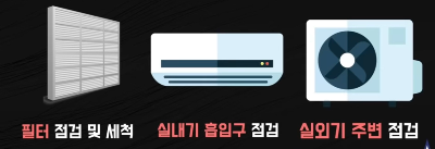 필터 점검 및 세척, 실내기 흡입구와 실외기 주변의 환기 상태를 점검한 후에 에어컨을 작동해서 현재 기온보다 5도 낮게 설정하거나 18도로 약 20분 정도 작동해 보면서 작동 중 소음이나 배수 호스 등을 점검해 봅니다.