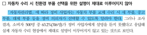 만약 이 사실을 몰랐더라도 자동차 관리법에 따라 정비소에서 자동차 부품 교체 수리 시에 새 부품, 중고 부품, 대체 부품 등을 소비자가 선택할 수 있도록 알려야 할 의무가 있습니다.