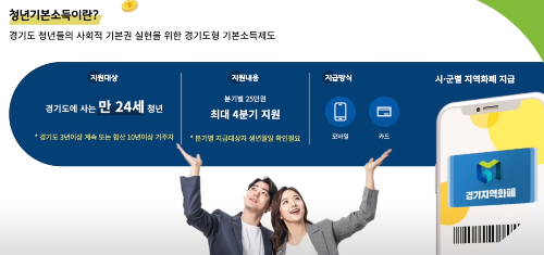경기도에 사는 만 24세 청년모두에게 똑같이 분기별 25만 원씩 총 100만 원을 지급합니다