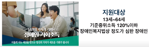 먼저 장애인 기회소득은 13세에서 64세 기준 종이 소득 120% 이하의 정도가 심한 장애인에게 6개월간 월 5만 원씩 총 30만 원 을지 급한 제도입니다.