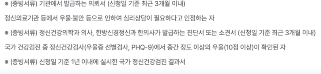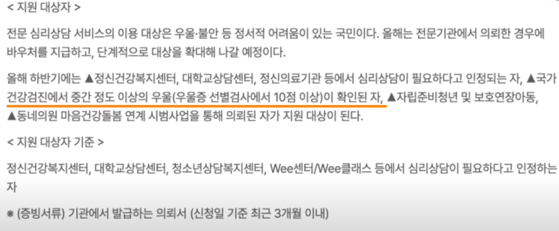 정신 건강 복지 센터대학교 상담센터 정신 의료 기관등에서 심리 상담이 필요하다 고인정 되는 자 국가 건강 검진에서 중간