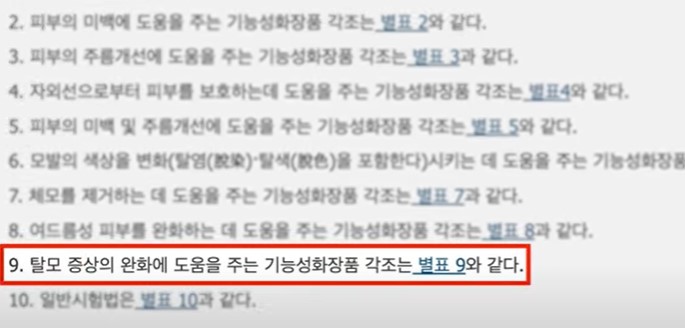 다음과 같은 4가지 성분이 일정 함량 들어가면 탈모라는 이름을 붙여서 기능성 화장품으로 판매할 수 있도록 한 내용입니다.