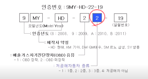 질소 산화물이나 탄화수소 배출량이세부적으로 나와 있지만 일일이 기준수치를 기억하기 어렵기 때문에 위쪽에 인증번호 9자리 중에서 7번째 숫자가 배출가스 등급을 나타내는 거라서 이곳만 하시면 됩니다