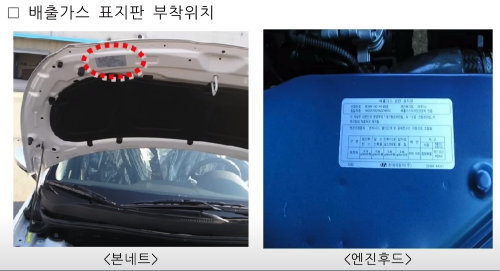 첫 번째는 보닛 상단이나 엔진 후두에 붙어있는 배출가스 표지판을 확인하는 방법입니다.