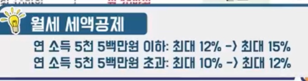 이외에도 월세 내시는 분들은 월세 세액공제가 기존 연소득 5500만 원 이하인 분들은 12%까지 공제가 됐지만 15%로 상향되고 연소득 5500만원 초과이신 분들은 10% 까지 공제가 됐지만 12%로 상향됩니다.