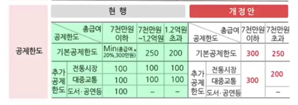 이번 개정안에는 연소득 7천만 원 이하 기준으로 구분 없이 합해서 300만 원으로 변경됩니다.