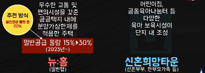 분양주택은 최근에 뉴:홈이라는 명칭의 일반형과 신혼부부와 한부모 가족 등에게 공급되는 신혼희망타운으로 나뉩니다.