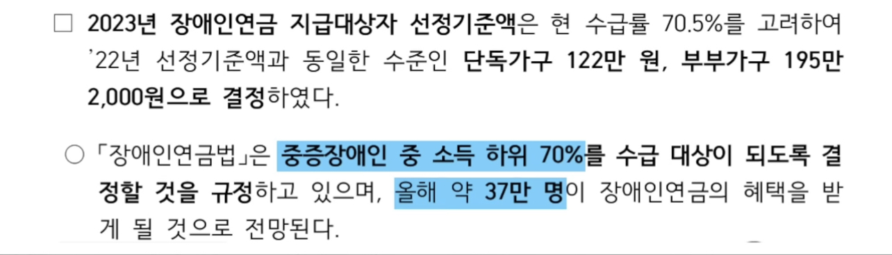 장애인 선정 기준액은 단독 가구 122만 원 부부가구 195만 2천 원으로 중증장애인 중 소득하위 70%, 약 37만 명이 장애인