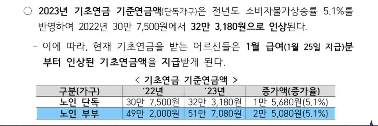 다음으로 1월 25일부터 지급되는 2023년 국민연금은 5.1% 상승됩니다.