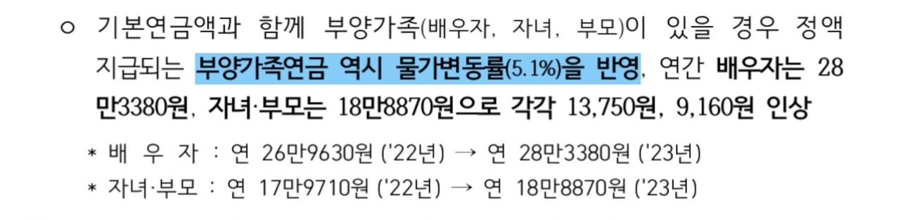 현재 국민연금을 받고 있는 약 622만 명에게 적용이 되는데요. 부양가족이 있는 경우에 추가로 지급되는 부양가족 연금액도 마찬가지로 5.1%가 인상됩니다.