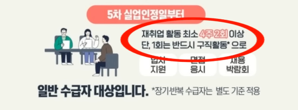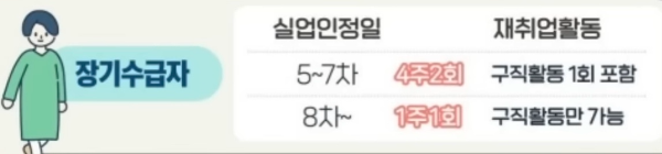 장기 수급자의 실업 인정일은 5차부터는 4주에 2회 이상 구직활동을 해야 하는데 여기에서는 반드시 실제 입사지원을 하는 구직활동이 1회 이상 포함되어야 합니다.