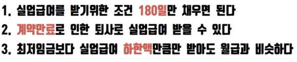 마지막으로 최저임금보다 실업급여 하한액만큼만 받아도 월급과 비슷하기 때문입니다.