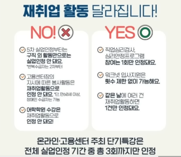마지막으로 재취업 활동으로 인정받는 내용들이 달라지는 한번 참고하시면 좋을 것 같습니다.